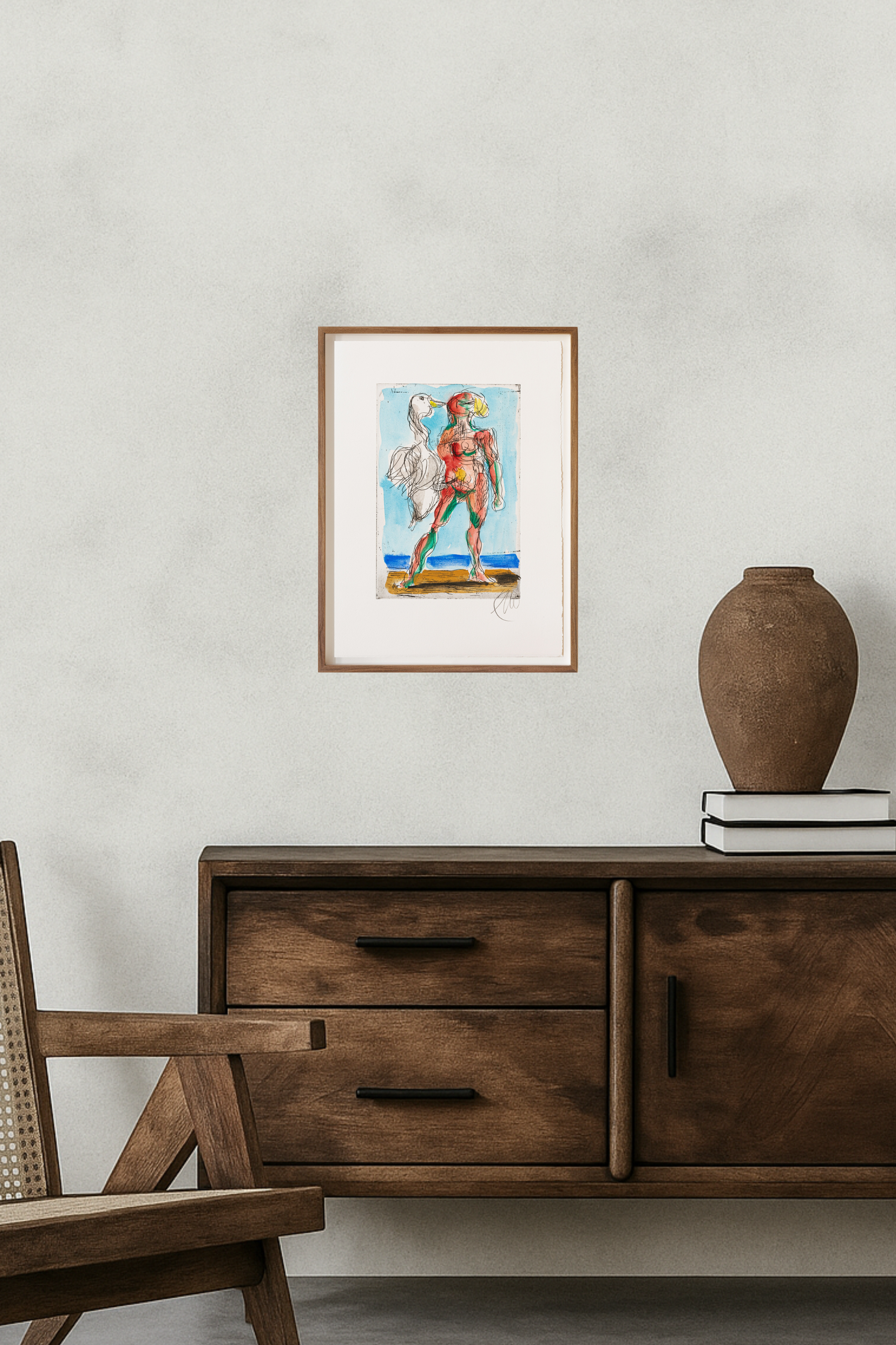 Die Druckgraphik Leda, 2025 des Künstlers Markus Lüpertz basiert auf seiner gleichnamigen Skulptur, die seit 2019 am Rheinufer in Monheim am Rhein steht. Das Werk zeigt die mythologische Figur Leda zusammen mit einem Schwan, ein Thema, das Lüpertz in mehreren bildhauerischen und grafischen Arbeiten aufgegriffen hat. Diese Druckgraphik wurde von Hand übermalt und ist ein echtes Unikat.