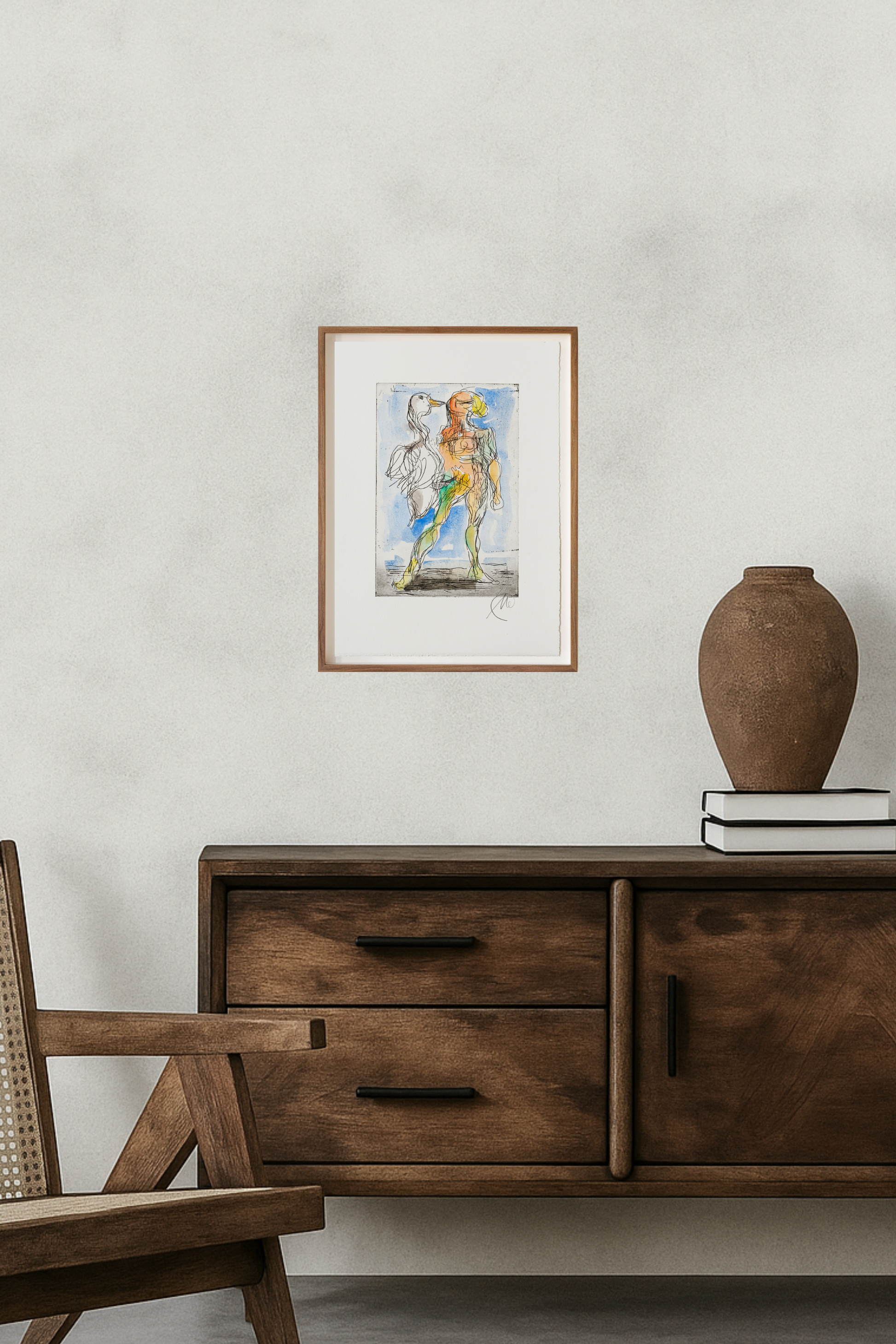 Die Druckgraphik Leda, 2025 des Künstlers Markus Lüpertz basiert auf seiner gleichnamigen Skulptur, die seit 2019 am Rheinufer in Monheim am Rhein steht. Das Werk zeigt die mythologische Figur Leda zusammen mit einem Schwan, ein Thema, das Lüpertz in mehreren bildhauerischen und grafischen Arbeiten aufgegriffen hat. Diese Druckgraphik wurde von Hand übermalt und ist ein echtes Unikat.