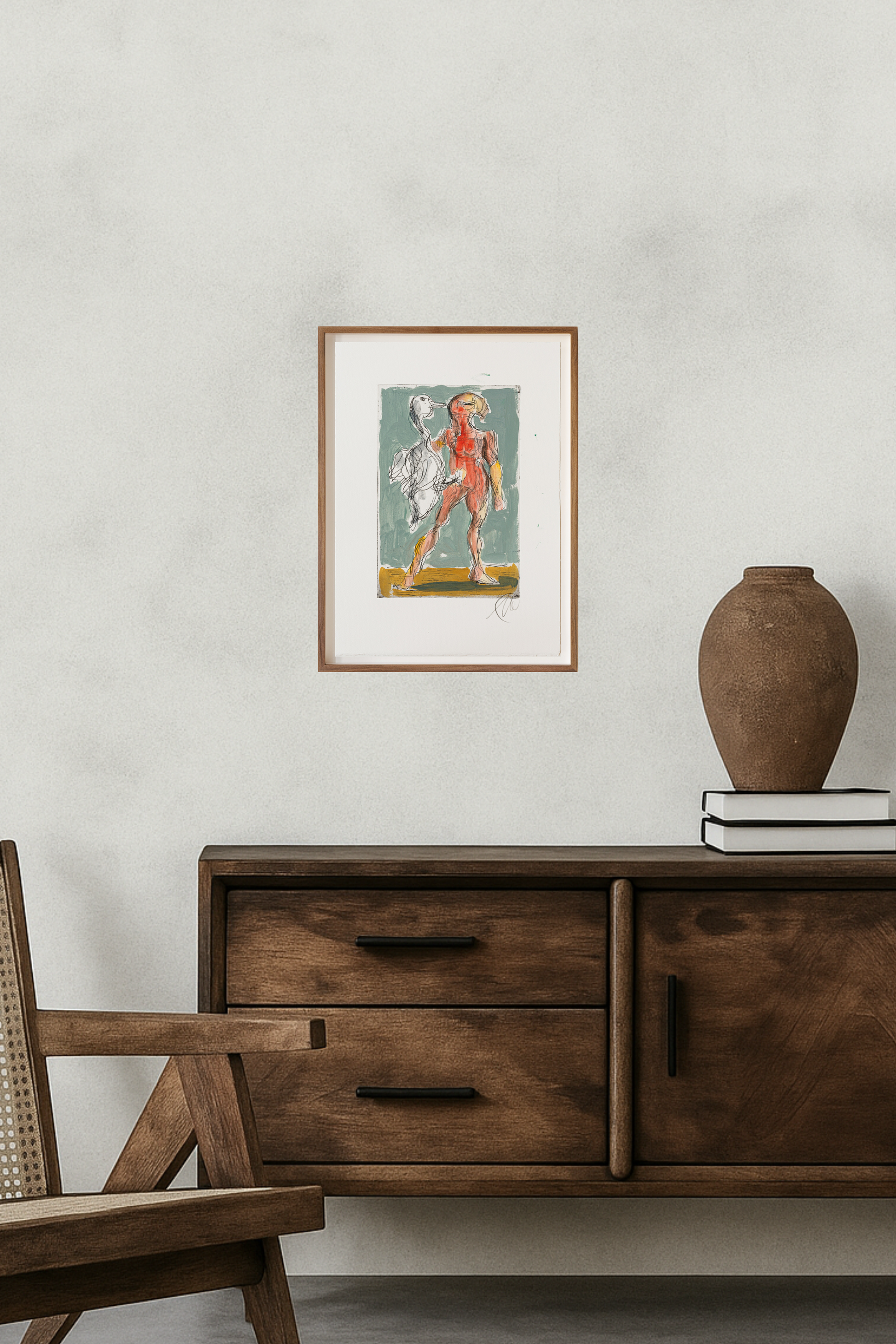 Die Druckgraphik Leda, 2025 des Künstlers Markus Lüpertz basiert auf seiner gleichnamigen Skulptur, die seit 2019 am Rheinufer in Monheim am Rhein steht. Das Werk zeigt die mythologische Figur Leda zusammen mit einem Schwan, ein Thema, das Lüpertz in mehreren bildhauerischen und grafischen Arbeiten aufgegriffen hat. Diese Druckgraphik wurde von Hand übermalt und ist ein echtes Unikat.